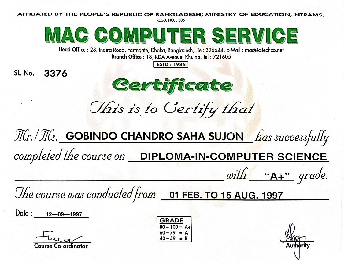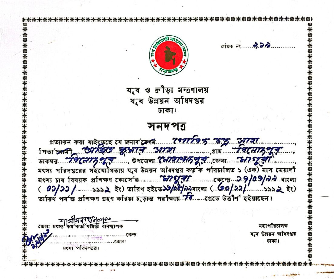 He is an experienced and high skilled technician and has earned training awards and certificates from various organizations such as : Intari, MAC Computer Service, যুব ও ক্রীড়া মন্ত্রণালয়