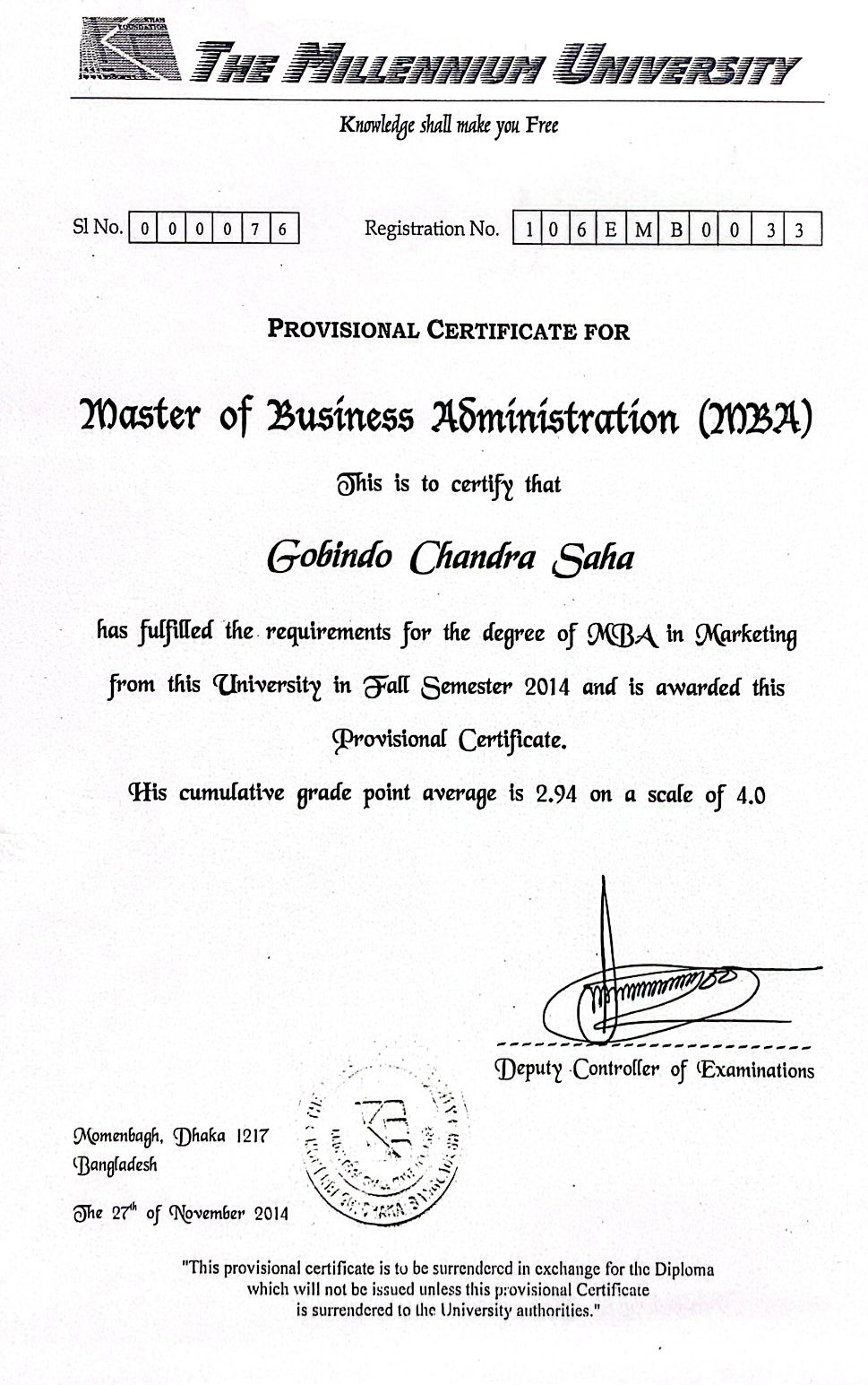 Mr. Saha has also earned his MBA degree from The Millenium University